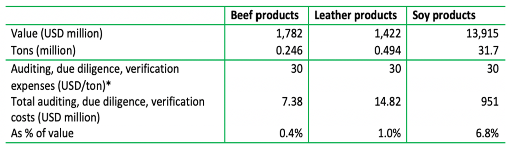 Source: Chain Reaction Research, based on previous report in 2022. *The palm oil per ton policy execution/monitoring/verification costs include around USD 30 for premium pricing of certificated oil; for beef and soy these costs are not included in this calculation, leading to ca USD 30 per ton for policy execution/monitoring/verification.