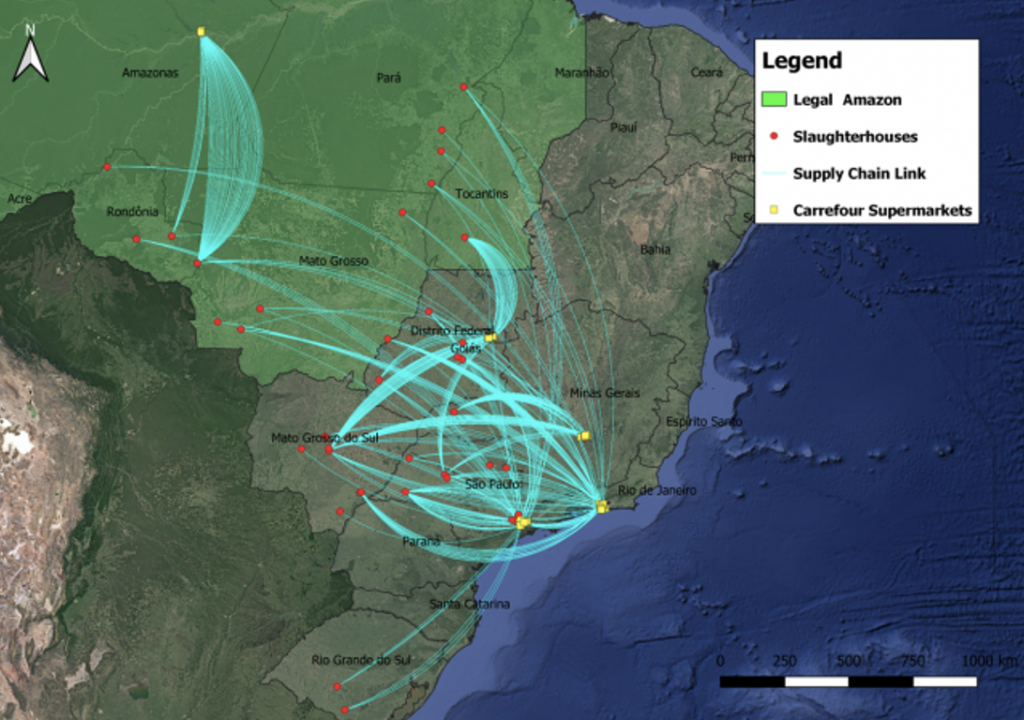 Source: Chain Reaction Research, based on AidEnvironment data. Figure visualizes the supply chain linkages of Brazilian slaughterhouses and Carrefour supermarkets identified through the analysis of 480 Carrefour beef products.
