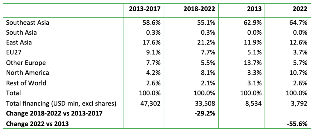 Financiers, particularly those in Europe, have reduced their exposure to forest-risk activities. An important consequence of a sharp increase in attention to deforestation reduction and the establishment of deforestation policies is FIs having materially reduced their exposure to activities that could be linked to commodities with a high deforestation risk. For instance, from 2013 to 2022, the identified financial flows to the Indonesian palm oil sector declined by 56 percent (Figure 4 below). In a five-year period, financial flows declined by 29 percent. The relative position of European FIs has declined, while North American and East Asian (mostly Japanese) FIs saw an increase in its relative position.