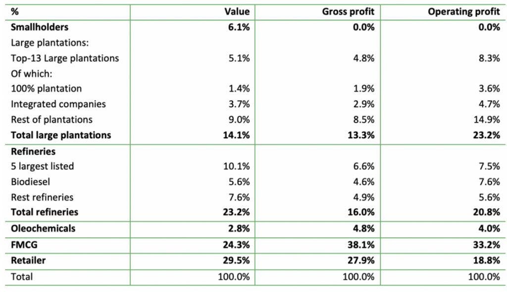 Figure 5: Percentage distribution of value and profit generated in the palm oil chain