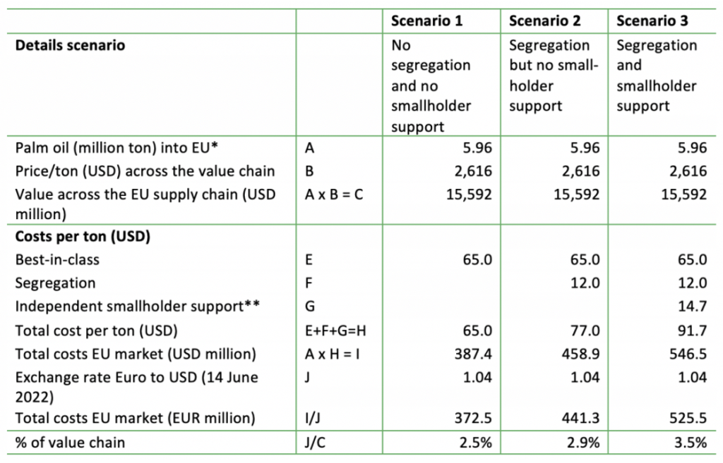 In a CRR report on the implications of the EU Deforestation Regulation, a similar methodology was applied. In various scenarios excluding and including extra costs for segregated supply chains and smallholder support, the total costs would amount to 2.5 to 3.5 percent versus the end value in the supply chain of the embedded palm oil (Figure 7).
