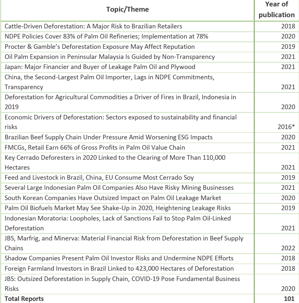 CRR has translated tangible and intangible sustainability risks into financial risks, including market access risk, legal risk, financing risk, stranded asset risk, and reputation risk. This analysis has helped asset managers’ sustainability officers engage fund managers about the various risks they were taking. Based on analyses in numerous CRR Reports (Figure 1), financial institutions could assess material risks of their clients, based on individual companies’ actions that are linked to deforestation, degradation, and wider environmental and social issues. This includes, but is not limited to, the loss of clients with No Deforestation, No Peat, No Exploitation (NDPE) policies; legal fees, fines, suspensions, and stop-work orders; operational risks such as strikes, property damage, and reduced yields (due to climate impacts); stranded assets, as recent or planned infrastructure or land acquisitions are no longer viable; and reputational damage.