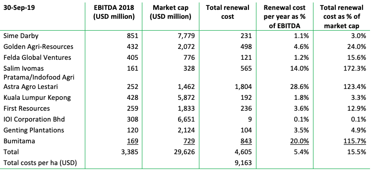 - In Figure 6, the total renewal costs (replanting + cash flow loss) for the upcoming 25-year period is related to the EBITDA of 2018 and the market capitalization at 30 September 2019.