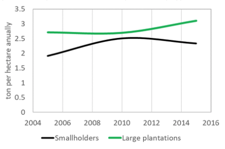 Productivity of smallholder plantations is commonly lower than large company plantations. The low productivity is mainly caused by poor quality of seedlings, inadequate application of fertilizers, or aging plantations.