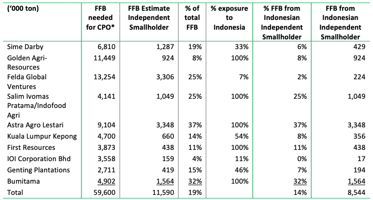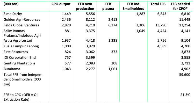 Large palm oil companies’ own CPO mills source 19 percent of FFB from smallholders