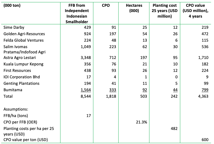 The planting costs and loss of cash flow add up to USD 9,163 per hectare (see a section above and also Figure 6 in the appendix). Independent smallholders which supply the top-10 palm oil companies’ own CPO mills would need to spend in total USD 4.6 billion for the upcoming renewal of trees (USD 242 million) and loss of cash flow (USD 4.4 billion). They own an estimated 503,000 ha of land (see Figure 5 appendix). This area may be up for tree renewal in the next 25 years. The USD 4.6 billion translates to USD 0.2 billion per year if it is spread out over these 25 years. With a total 2018 EBITDA of USD 3.4 billion for the top-10 (see appendix Figure 6), the USD 0.2 billion would mean 5.4 percent versus the total 2018 EBITDA for the top-10. As percentage of the top-10 companies’ market cap, the total renewal cost is 15.5 percent. For Astra Agro Lestari, Bumitama and Indofood Agri-Resources, however, the relative numbers would create a financially risky situation. The net-debt/EBITDA multiple 2018 and pro-forma 2018 leads to the same conclusion (not included in the appendix): problems for the three companies, but the net-debt/EBITDA ratio for the top-10 would move from 2.6X to pro-forma 4.0X.