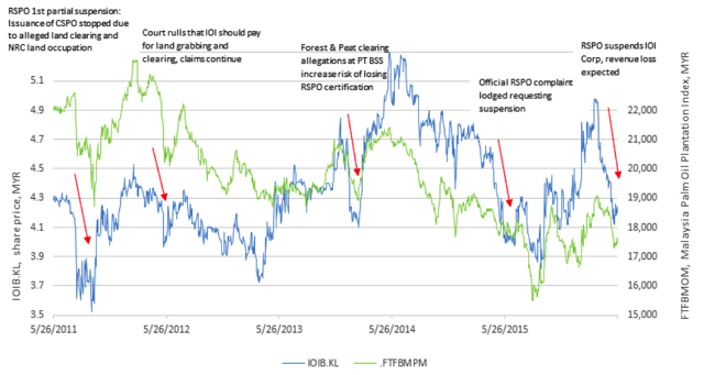 Figure 2: IOI equity price volatility related to landbank and RSPO concerns (Source: Thomson Reuters and Aidenvironment).