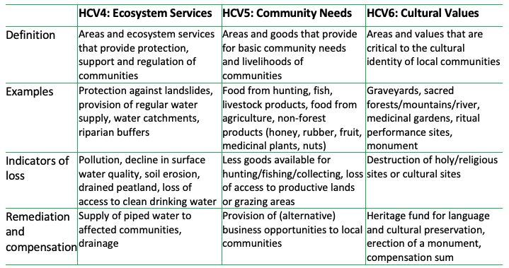 Source: Compilation by CRR, based on several sources: HCV Resource Network (HCVRN), RSPO Guidance on HCV Identification, RSPO Remediation and Compensation Procedure