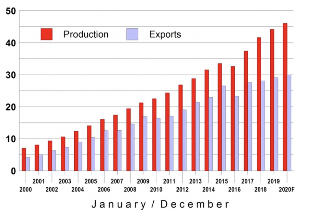Figure 2: Indonesian palm oil production and exports (million tons)