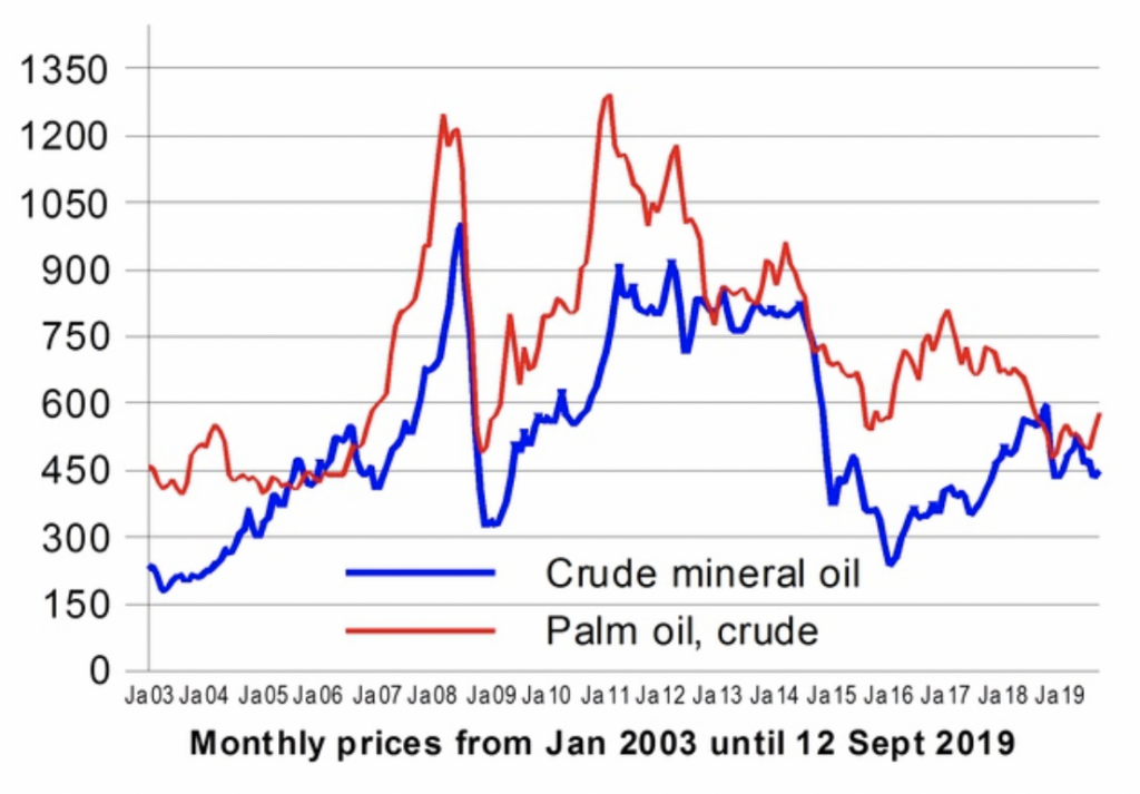 Figure 7: Monthly Prices of Palm Oil & Crude Mineral Oil (USD/T)