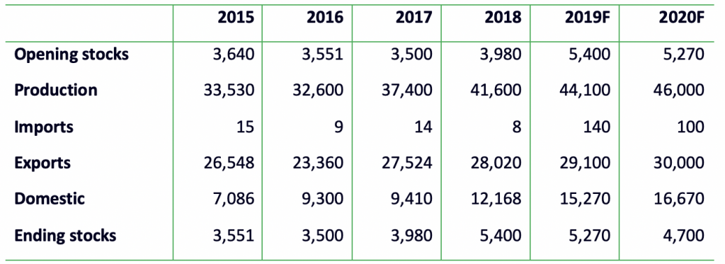 - China is increasing its use of palm oil-based biofuels as a cheap alternative to crude oil. In August 2019, Beijing announced it would remove import quotas on crude palm oil. China’s imports may jump to 7 million tons in market year 2019/20.