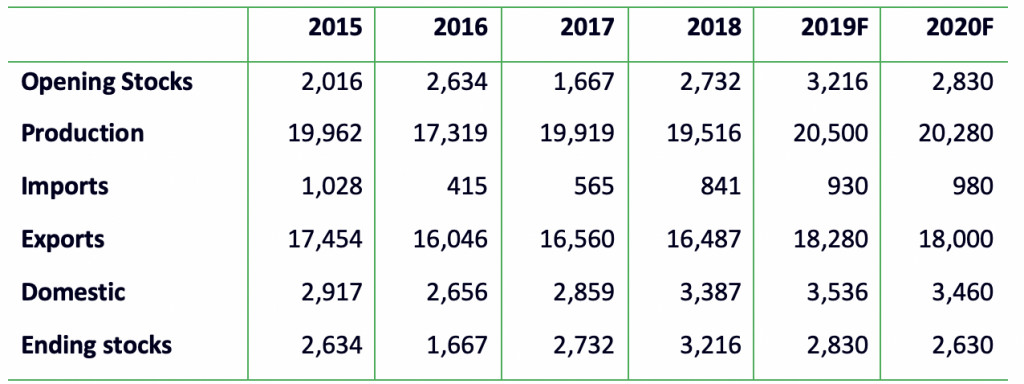 Figure 4: Palm oil production, exports and stocks in Malaysia (1,000T)