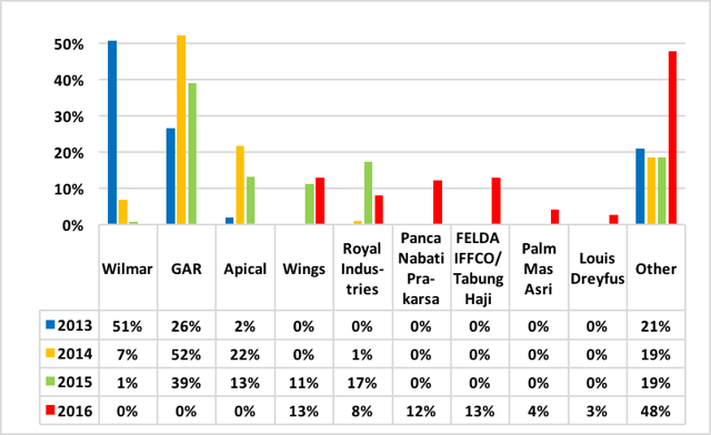 As a result of SSMS losing it clients with NDPE policies in 2014 and 2015, SSMS’s largest new clients are mostly companies that have weak or nonexistent NDPE policies. This means that SSMS new clients are the traders and refiners that facilitate the trade in palm oil from non-compliant sources, which is called leakage.