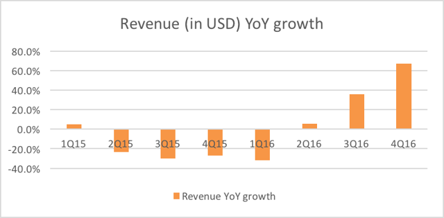 Figure 8: SSMS revenue (NYSEARCA:USD) year-over-year growth, 2015-2016.