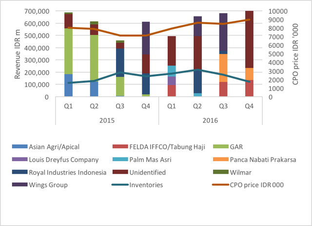 As shown in Figure 9 (below), SSMS revenue/sales weakness from Q2 2015 onwards came from both weaker global CPO prices and weaker volumes. After SSMS had lost its three major buyers in H2 2015, it had to find substitute buyers in Q3 2015. Q2 2015 Wilmar and Apical represented 16 percent and 12 percent of SSMS revenue. Sales to PT Sinar Mas Agro Resources and Technology Tbk (SMART), generating 30 percent of SSMS revenue, also decreased to 3 percent. As shown in Figure 9 (below), it took SSMS one quarter to secure Royal Industries Indonesia and Wings Group as replacement buyers. By Q4 2015, SSMS sourced 28 percent of its revenue from them.