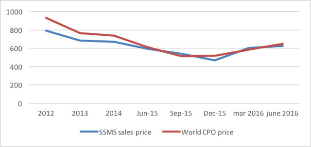 Figure 10: World CPO price per ton versus SSMS sales price per ton (in USD), 2012-H1 2016.