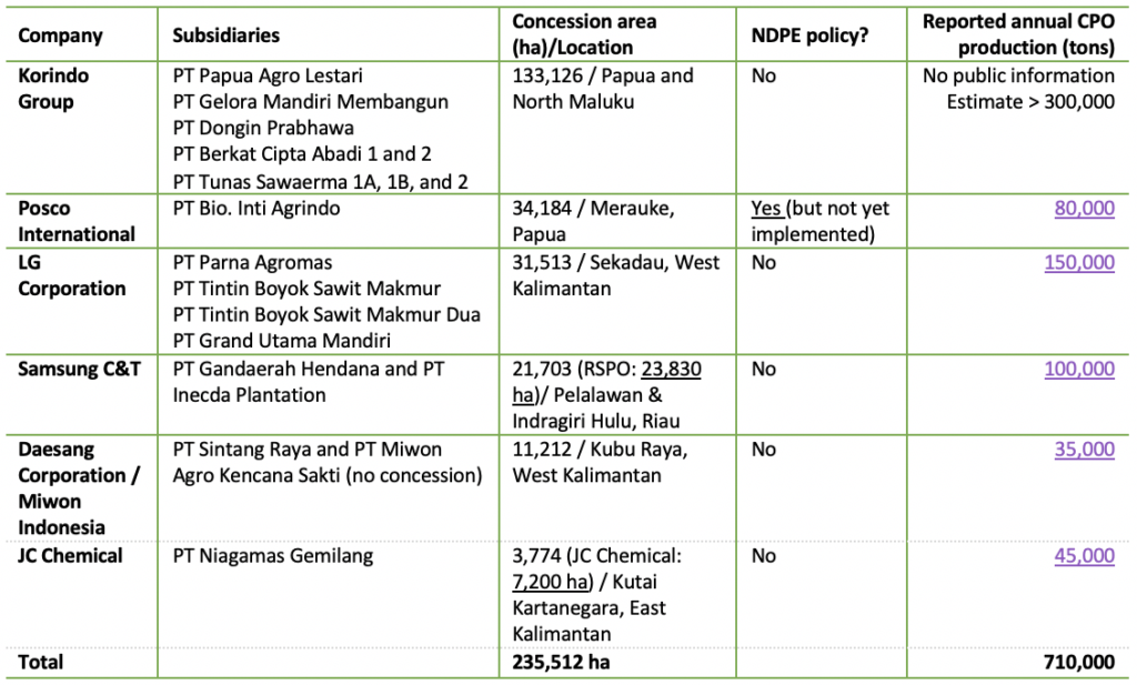 - Six South Korean plantation owners have significant non-compliance issues linked to environmental, social, and human rights issues: Posco International, Korindo Group, Samsung C&T, Daesang Corporation, LG Corporation, and JC Chemical.