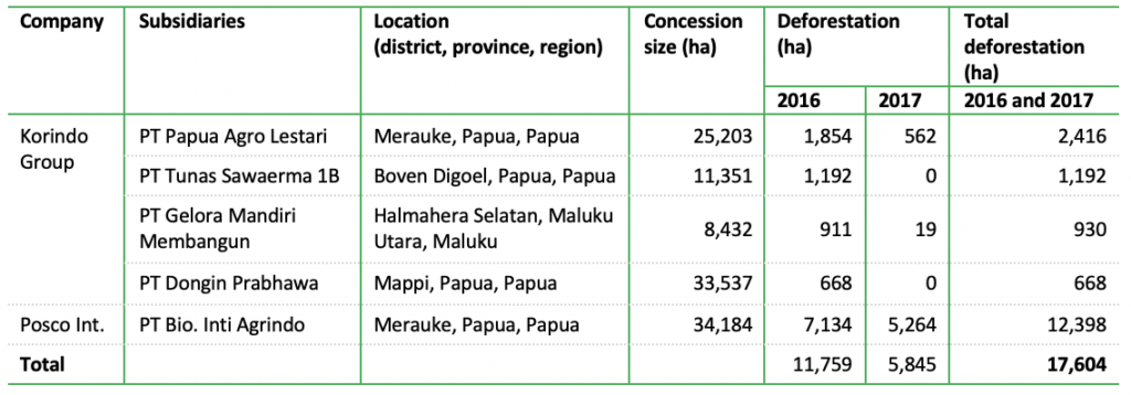 - Korindo and Posco have the highest amount of deforestation of all six companies. In 2016 and 2017, concessions belonging to both cleared over 17,500 ha of forest. Moreover, Daesang Corporation cleared 347 ha of peatland on its plantation concession after 2016.