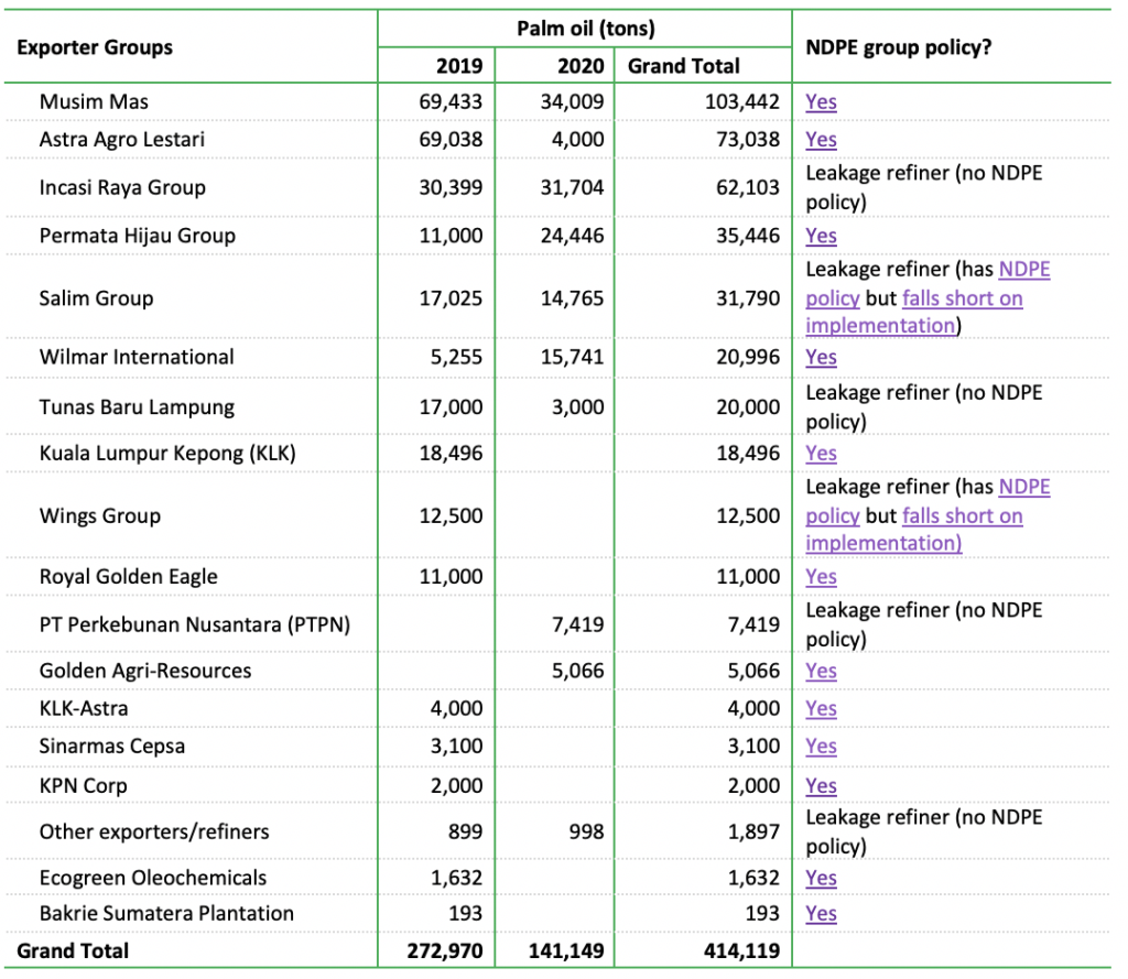 Source: Retrieved Indonesian trade data, corporate websites, CRR paper leakage refiners. PFAD exports are not included, and 2020 only covers the first half year.