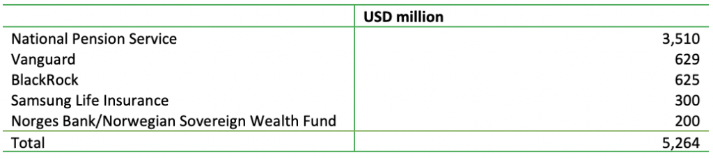 Next to Posco, NPS is also the main shareholder of South Korean companies Samsung C&T, LG International and SK Eco Prime, as of April 2020, with investments of respectively USD 5.4 million (USD 1.3 billion unadjusted), USD 2.2 million (USD 37 million unadjusted) and USD 110 million (unadjusted).