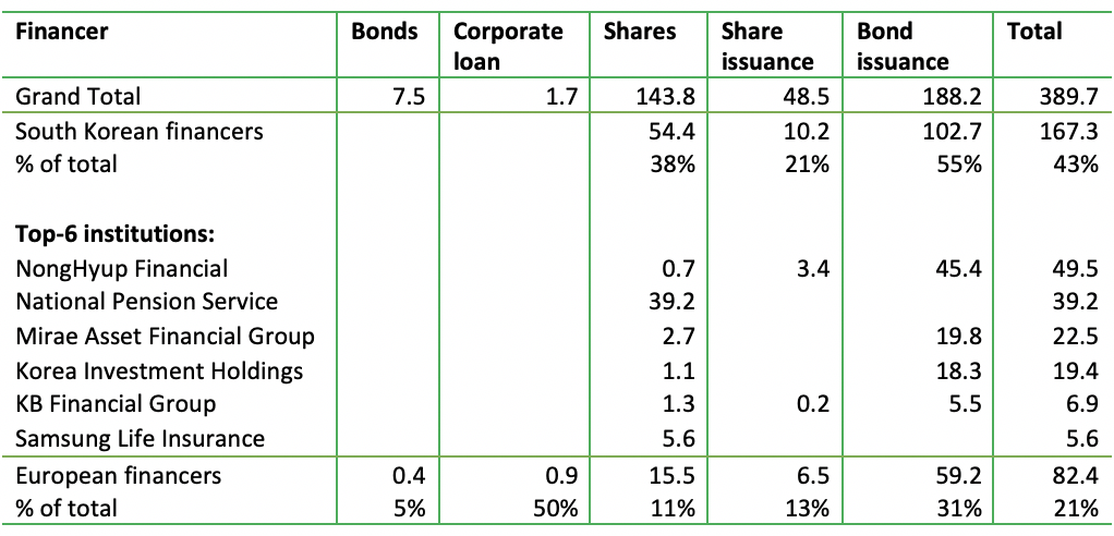 Along with the National Pension Service (see next section), other South Korean investors include NongHyup Financial, Mirae Asset Financial Group, Korea Investment Holdings, KB Financial Group and Samsung Life Insurance. These investors do not have policies on deforestation.