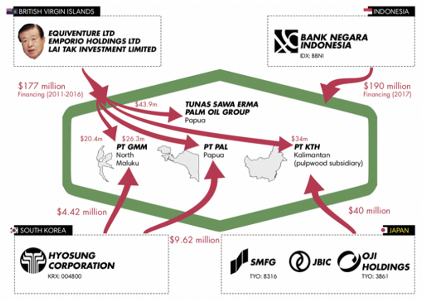 Hyosung Corporation, a Korean family-owned conglomerate, and the only Korean company with shares in Korindo’s subsidiaries PT PAL and PT GGM, was confronted by KFEM in September 2016 on ESG violations of its investee company. Hyosung replied that it will “check the facts,” but in May 2019 it still had not taken any action. Finally, Korindo’s operations are financed for at least USD 177 million by a “cluster of opaque companies in the British Virgin Islands,” owned by Korindo’s chairman since 2011.