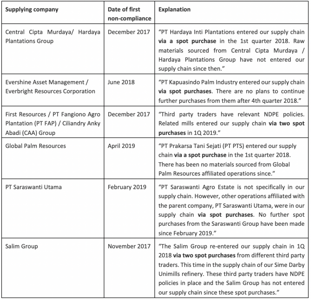 In response to questions for this report, Sime Darby confirmed to CRR that it had made two spot purchases at the end of 2019 and beginning of 2020 from Palma Serasih. Sime Darby did not provide volumes for these two purchases.
