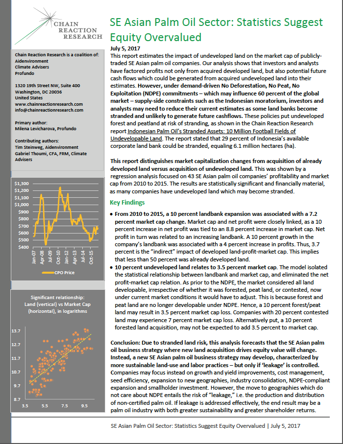 This report distinguishes market capitalization changes from acquisition of already developed land versus acquisition of undeveloped land. This was shown by a regression analysis focused on 43 SE Asian palm oil companies’ profitability and market cap from 2010 to 2015. The results are statistically significant and financially material, as many companies have undeveloped land which may become stranded.
