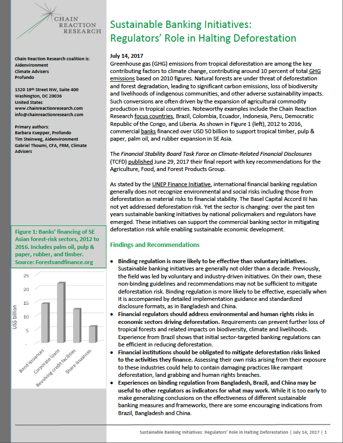 Greenhouse gas (GHG) emissions from tropical deforestation are among the key contributing factors to climate change, contributing around 10 percent of total GHG emissions based on 2010 figures. Natural forests are under threat of deforestation and forest degradation, leading to significant carbon emissions, loss of biodiversity and livelihoods of indigenous communities, and other adverse sustainability impacts. Such conversions are often driven by the expansion of agricultural commodity production in tropical countries. Noteworthy examples include the Chain Reaction Research focus countries, Brazil, Colombia, Ecuador, Indonesia, Peru, Democratic Republic of the Congo, and Liberia. As shown in Figure 1 (left), 2012 to 2016, commercial banks financed over USD 50 billion to support tropical timber, pulp & paper, palm oil, and rubber expansion in SE Asia.