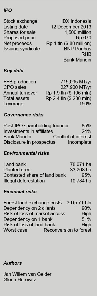 - SSMS is not disclosing all relevant facts (on land permits, related party transactions, etc.) in its English-language prospectus. While more relevant facts are included in the Indonesian-language prospectus, some critical information on applications with the Ministry of Forestry is missing there as well;