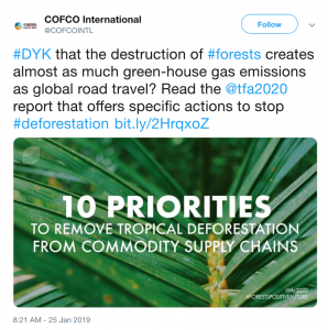COFCO, a major Chinese company active in agricultural markets, released a statement in late January at the World Economic Form (WEF) in support of shoring up “sustainable” practices and curbing deforestation in commodity supply chains. COFCO’s CEO, Jun Lyu, warned industry that failure to curb climate change could lead to poor crop production and limit companies’ ability to keep up with rising demand from population growth. This scenario would facilitate reputation and business risks. “The repercussions on businesses in terms of profit, reputation and investment will be catastrophic,” said Lyu. The company also endorsed forests as a solution to climate change, arguing for the need to develop agricultural supply chains that do not increase deforestation.