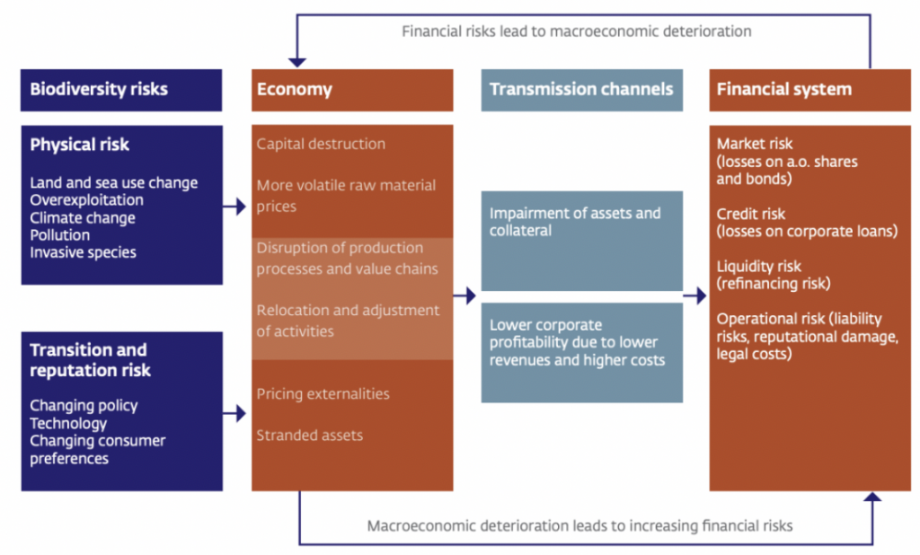 The report identified a number of key biodiversity risk exposures for the Dutch financial sector. Approximately EUR 96 billion in investments and loans are directly linked to companies with a negative impact on biodiversity, with an additional EUR 97 billion exposure to reputational risk through products and activities with likely deforestation links. Dutch financiers are also exposed to material transition risks related to changes in regulation and consumer preferences. Planetary boundaries for nitrogen, phosphorus, and genetic diversity are already nearing an inflection point, thus threatening ecosystem resilience and increasing the likelihood of expanded nature conservation zones and a growing regulatory emphasis on less nitrogen-intensive business models. The report identified EUR 81 billion in loans to high nitrogen-emitting sectors and a EUR 28 billion exposure to companies that operate in protected or high conservation value regions and face potential stranded assets risks. Figure 1 outlines the macroeconomic feedback loops generated by such exposures.