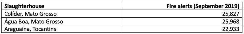 The decision also comes at the heels of the Amazon fire crisis that saw clouds of smoke throughout the region and alarming quantities of carbon released into the world’s atmosphere. These fires also burned within JBS’ supply chain. In total, NASA issued 145,482 fire alerts in September alone within JBS’ potential buying zone. The slaughterhouses in Colider (MT), Agua Boa (MT), and Araguaína (TO) saw the most alerts.