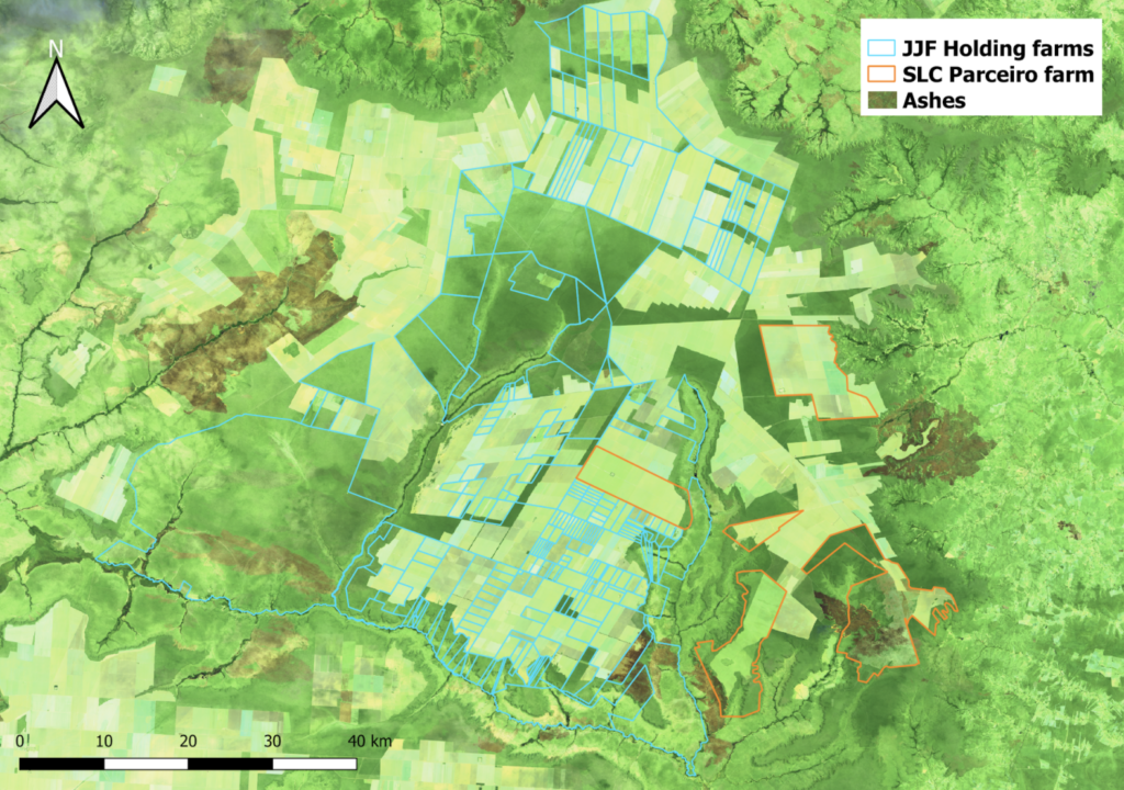 Fazenda Parceiro is located in Formosa do Rio Preto, the municipality with the single highest rate of Cerrado deforestation in recent years. The municipality has seen extensive wildfires rage over native vegetation and recently cleared land beyond this particular farm. It is also home to some of the most contentious cases of land-grabbing. Adjacent to the SLC Agricola farm, the area owned by JJF Holdings saw 7,199 ha of deforestation between August 2018 and August 2019. Furthermore, the 366,000-ha area is subject to longstanding legal proceedings, and the resulting land tenure insecurity drives deforestation. Cargill, Bunge, and ALZ Grãos all operate soy silos within this territory. As shown in the figures below, extensive wildfires have been detected within this area in October 2020.